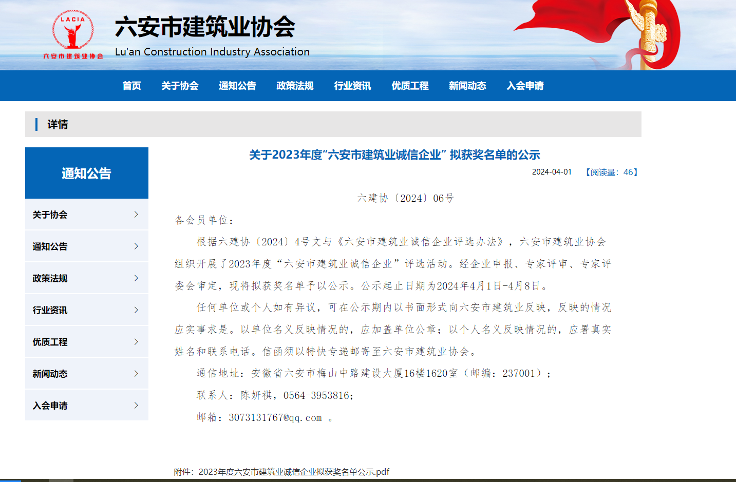 公司榮獲2023年度六安市建筑業誠信企業