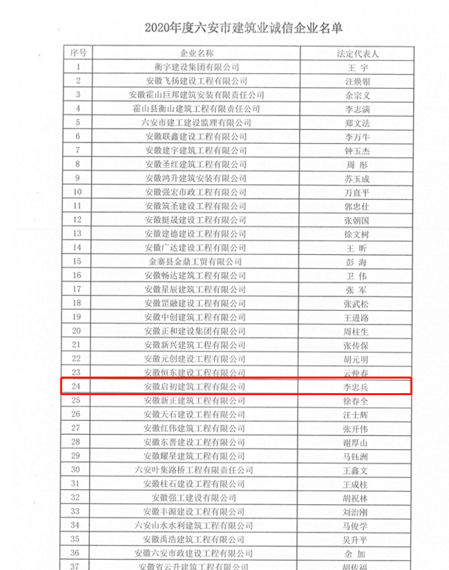 熱烈祝賀安徽啟初建筑公司榮獲:2020年度六安市建筑業誠信企業